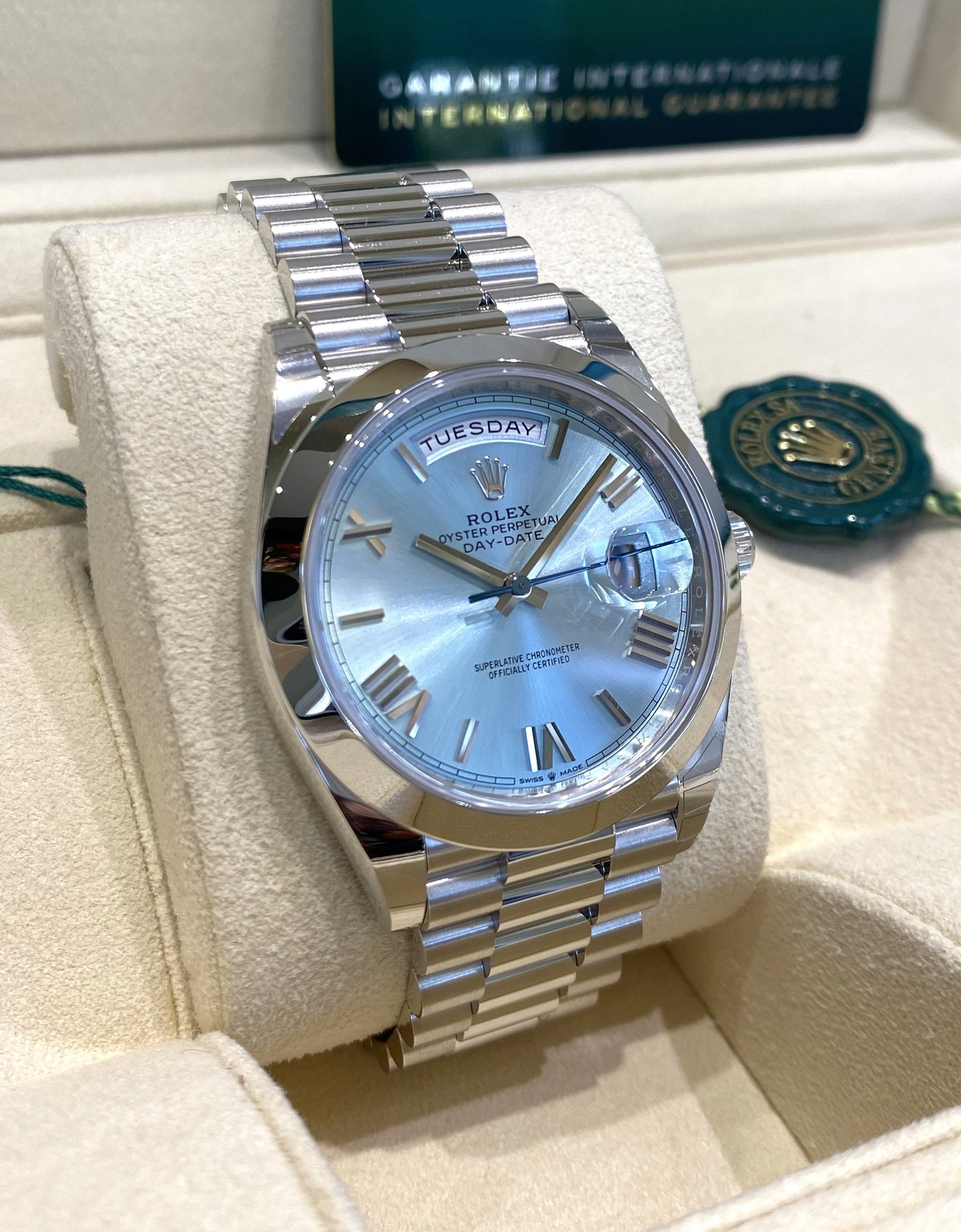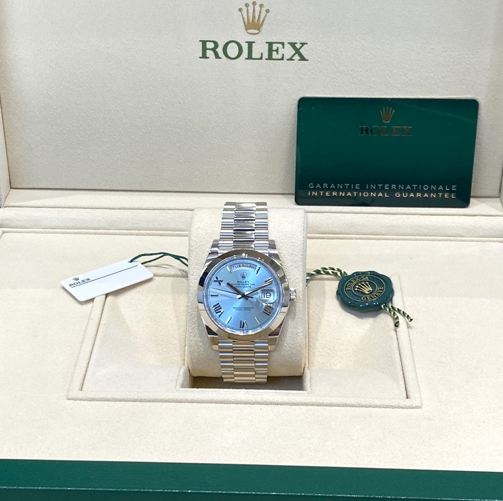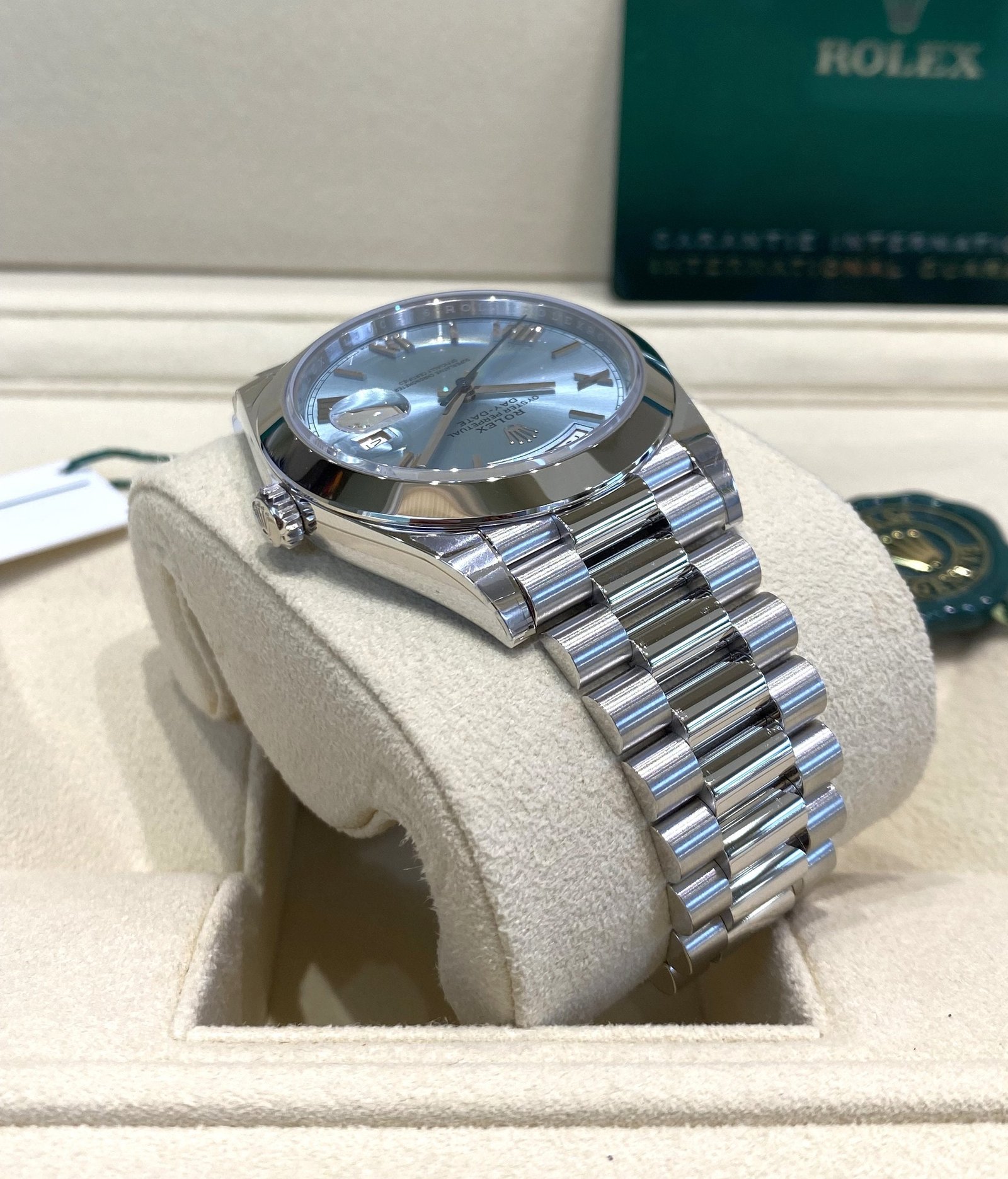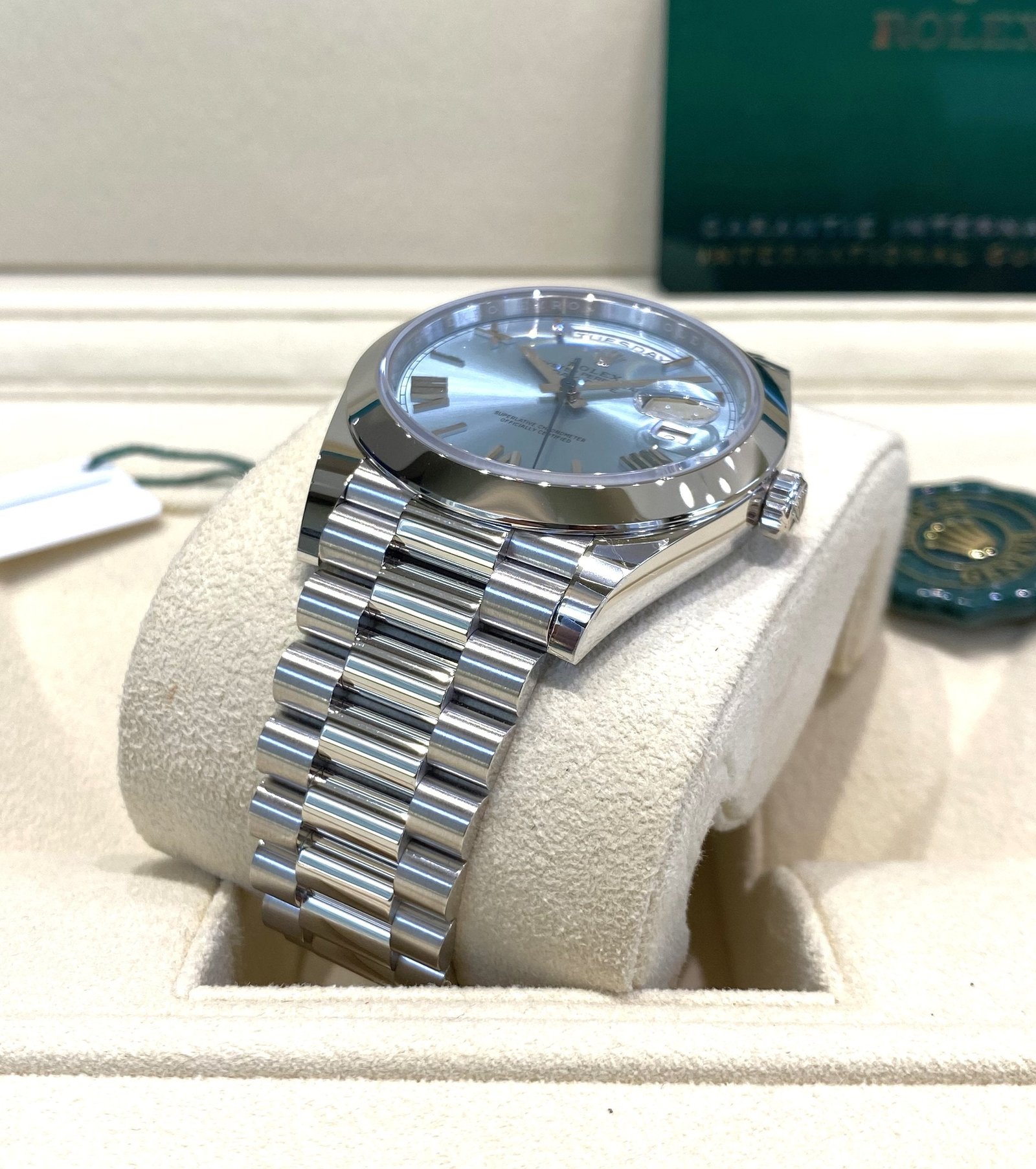 Case: Platinum case 40mm in diameter. Rolex logo on crown