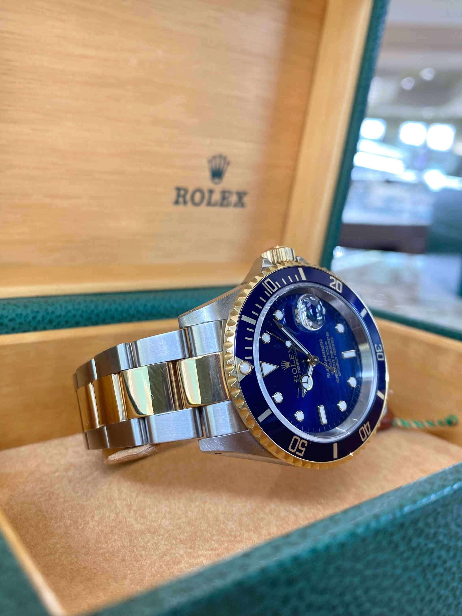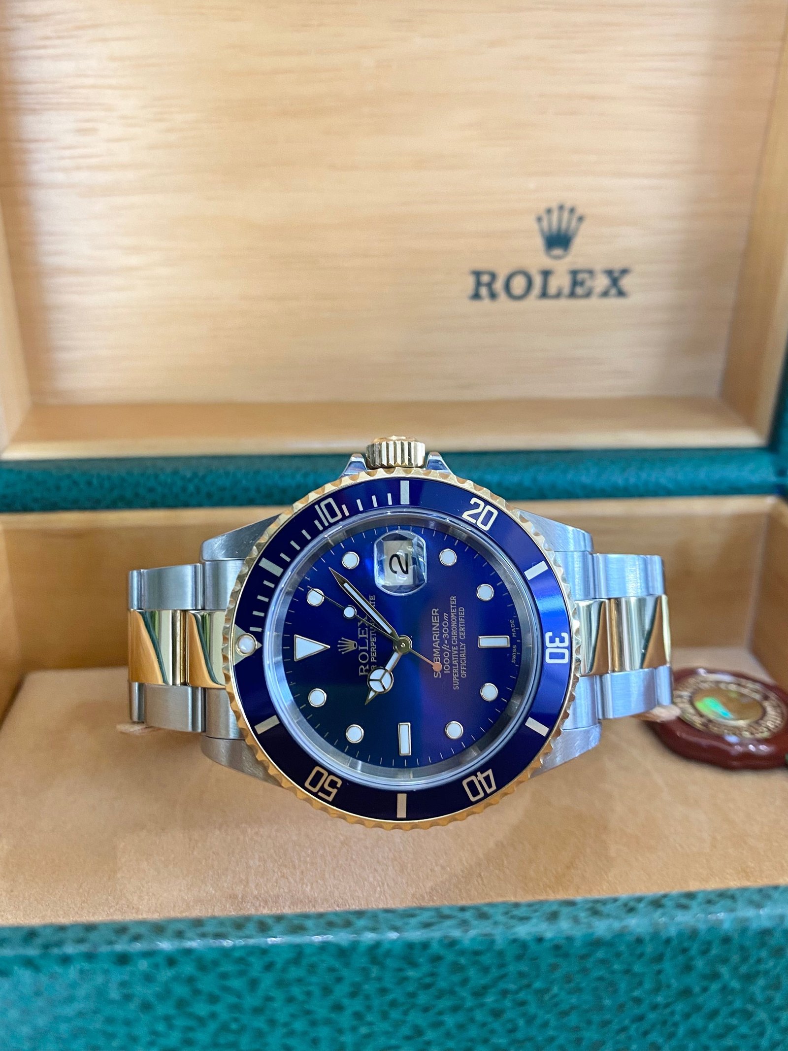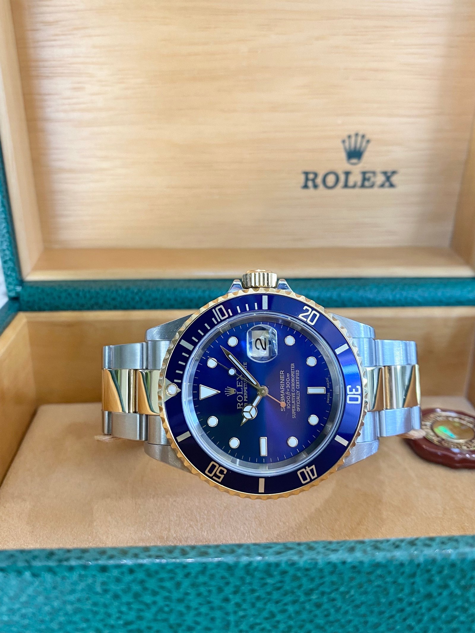 Dial: Blue dial with luminous inlay hands and hour markers. Date calendar at 3 o’clock aperture.