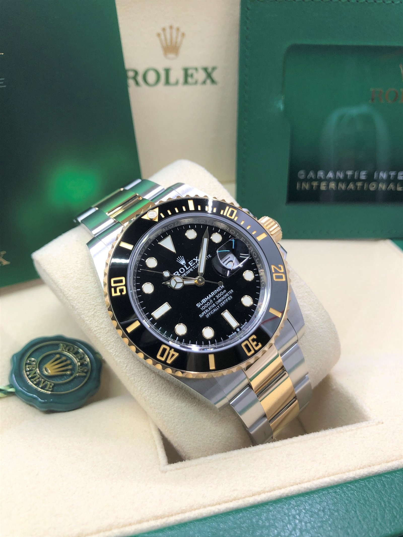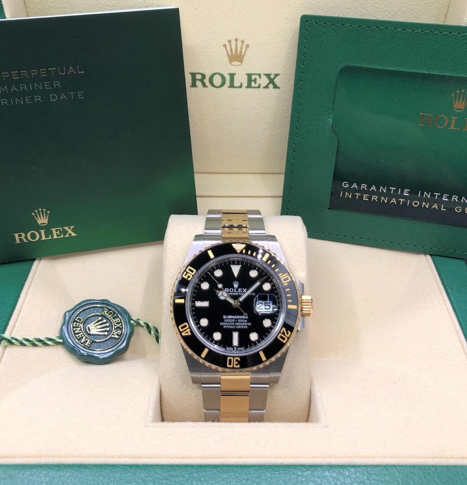 Box & Papers: Original Rolex box, papers, and green and white hangtags