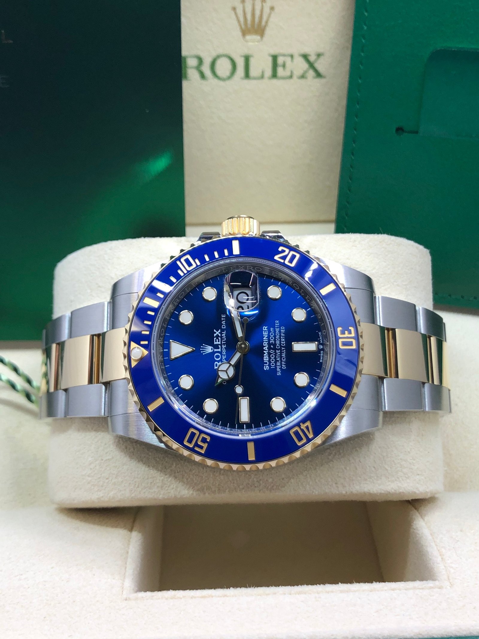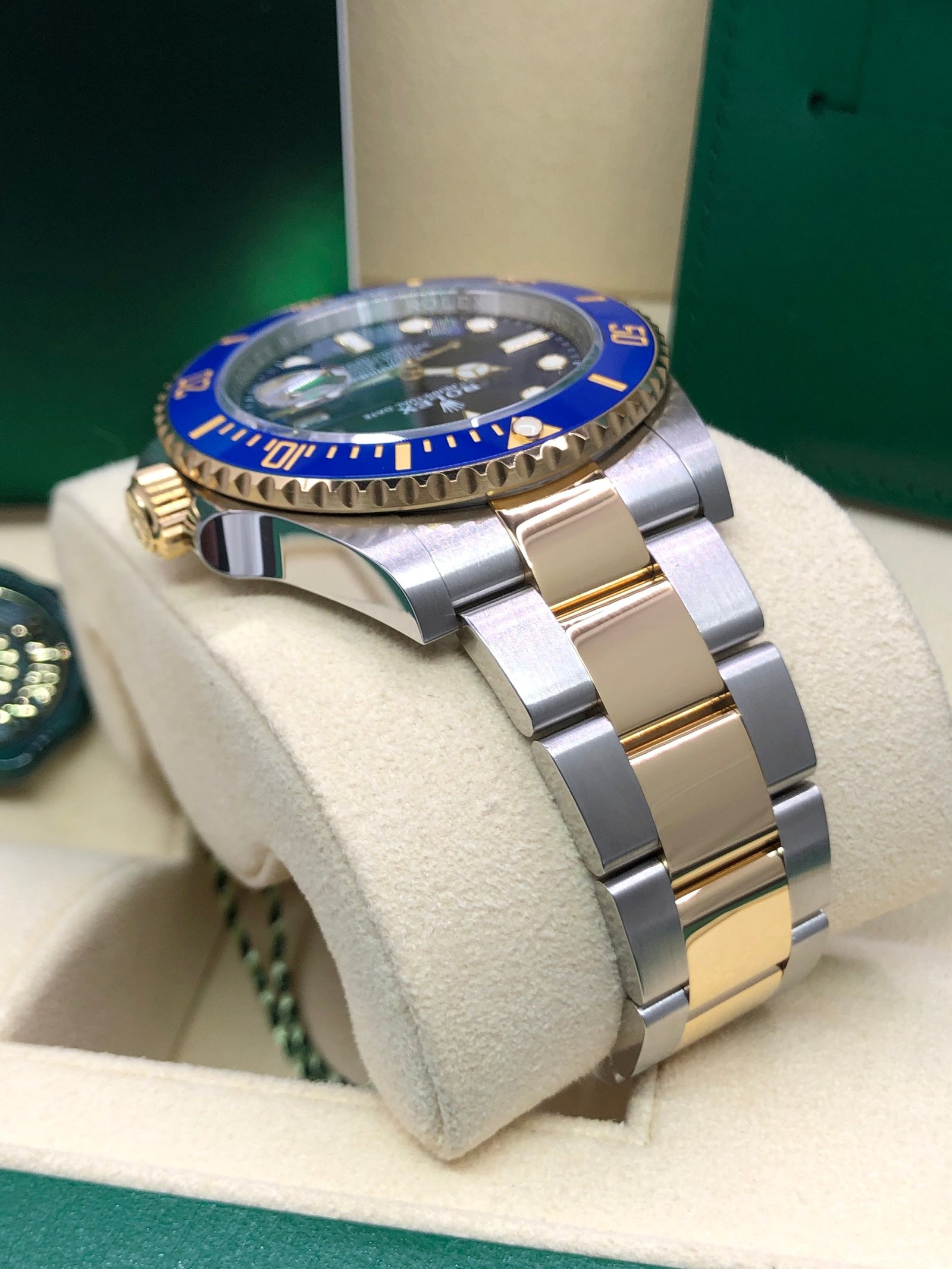 Bezel: Unidirectional blue ceramic bezel with 60 minute graduation. Inner engraved Rolex bezel ring