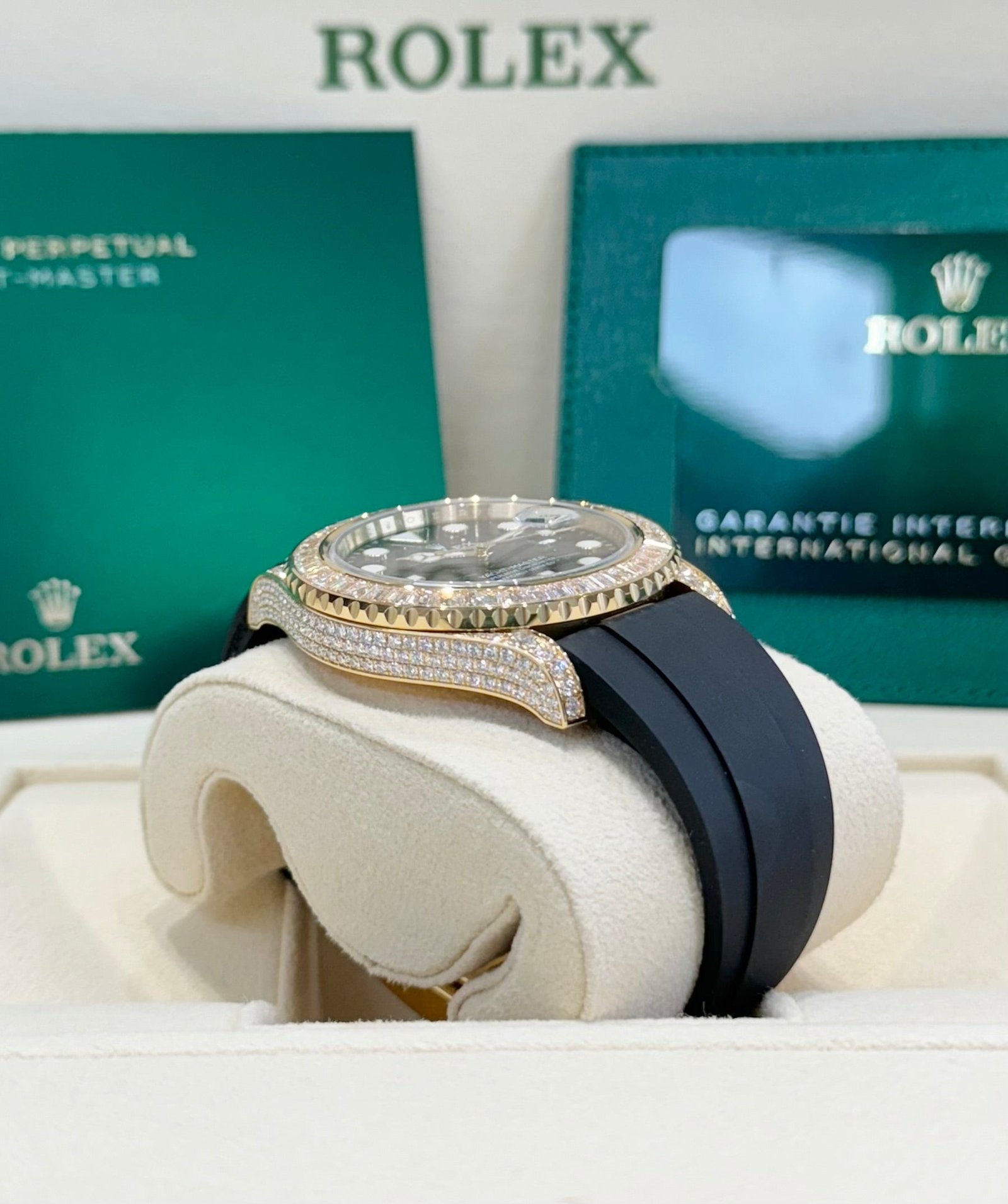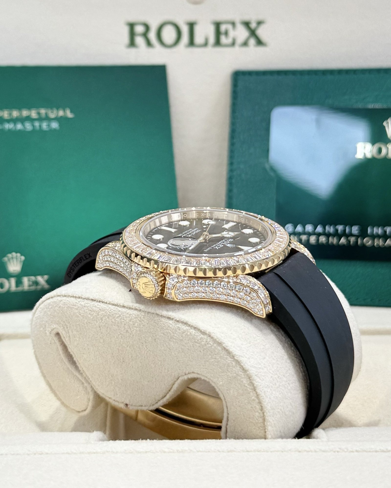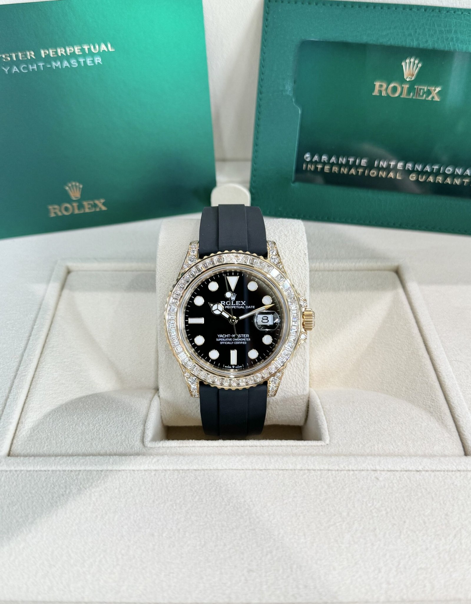 Bezel: 18ct yellow gold bezel set with baguette-cut diamonds. Inner engraved Rolex bezel ring