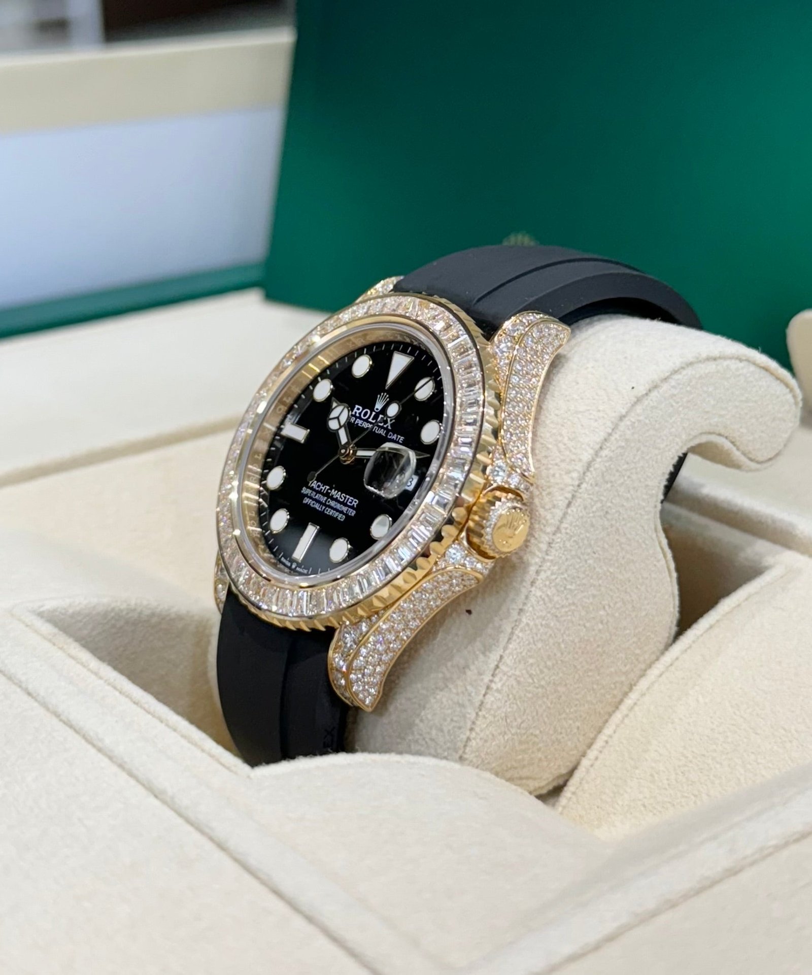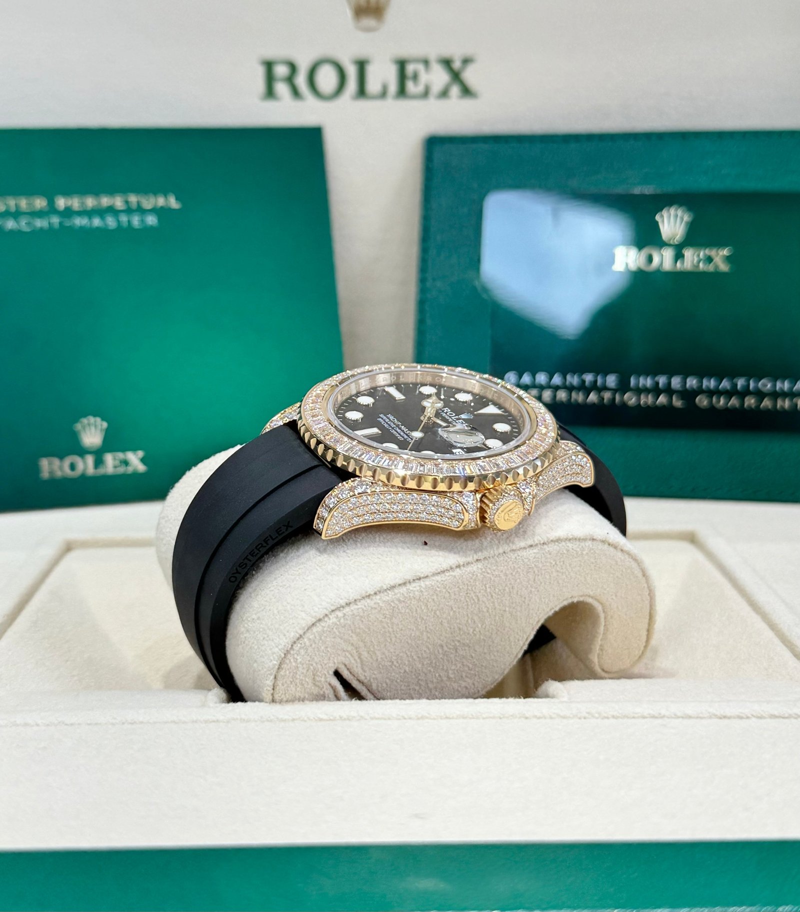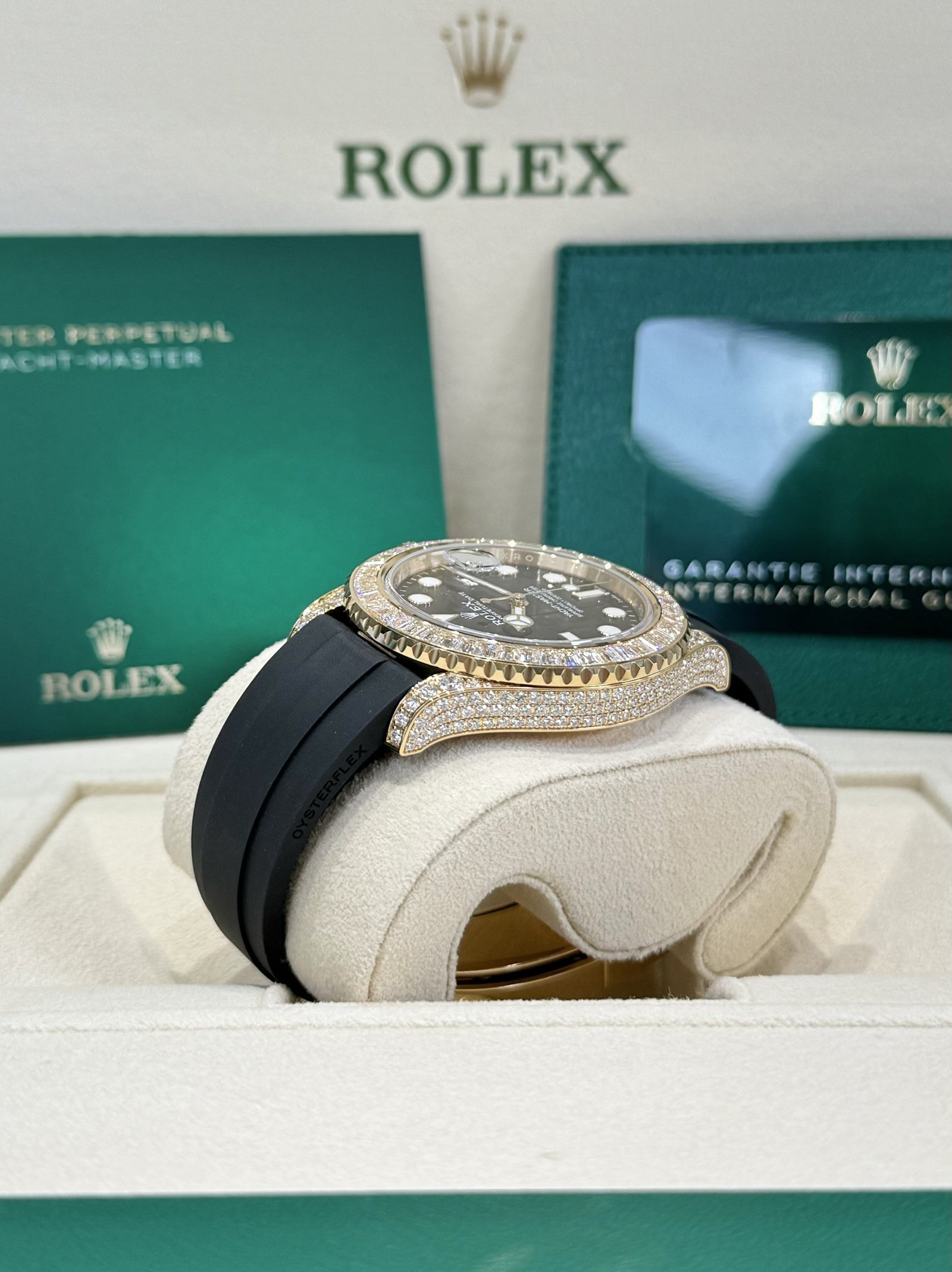Bezel: 18ct yellow gold bezel set with baguette-cut diamonds. Inner engraved Rolex bezel ring