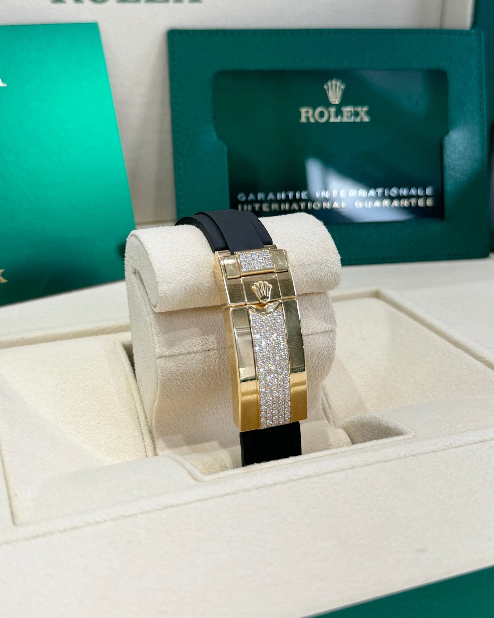 Case: 18ct yellow gold case 42mm in diameter with pave set round diamonds. Rolex logo on crown
