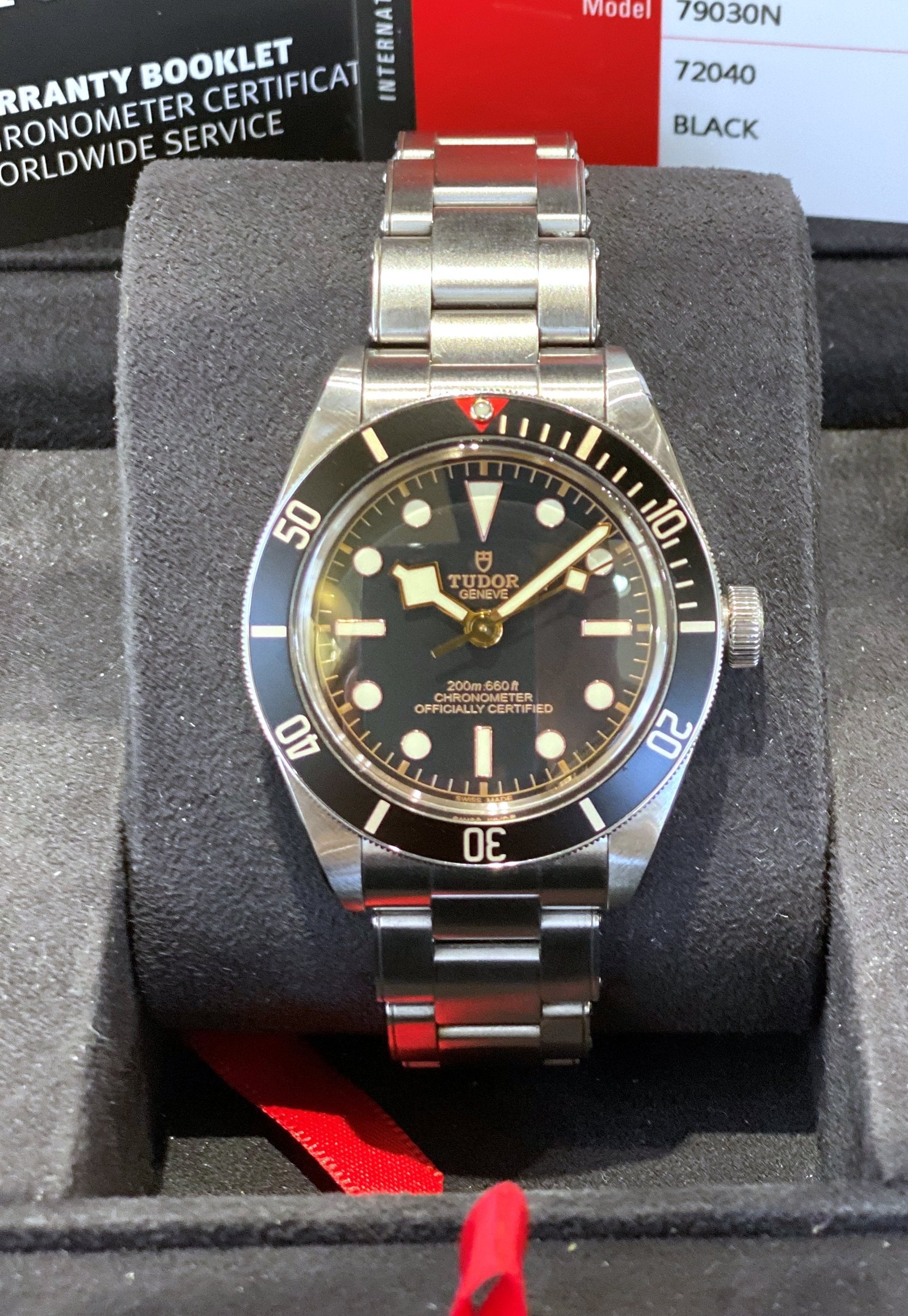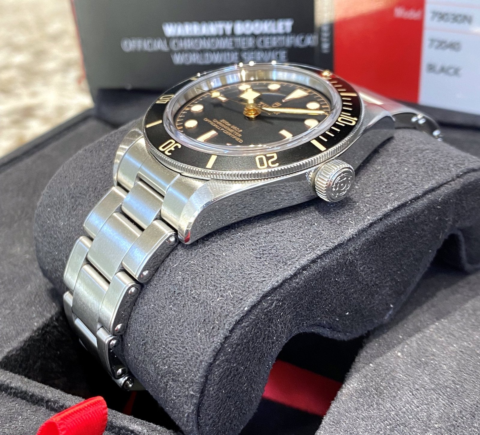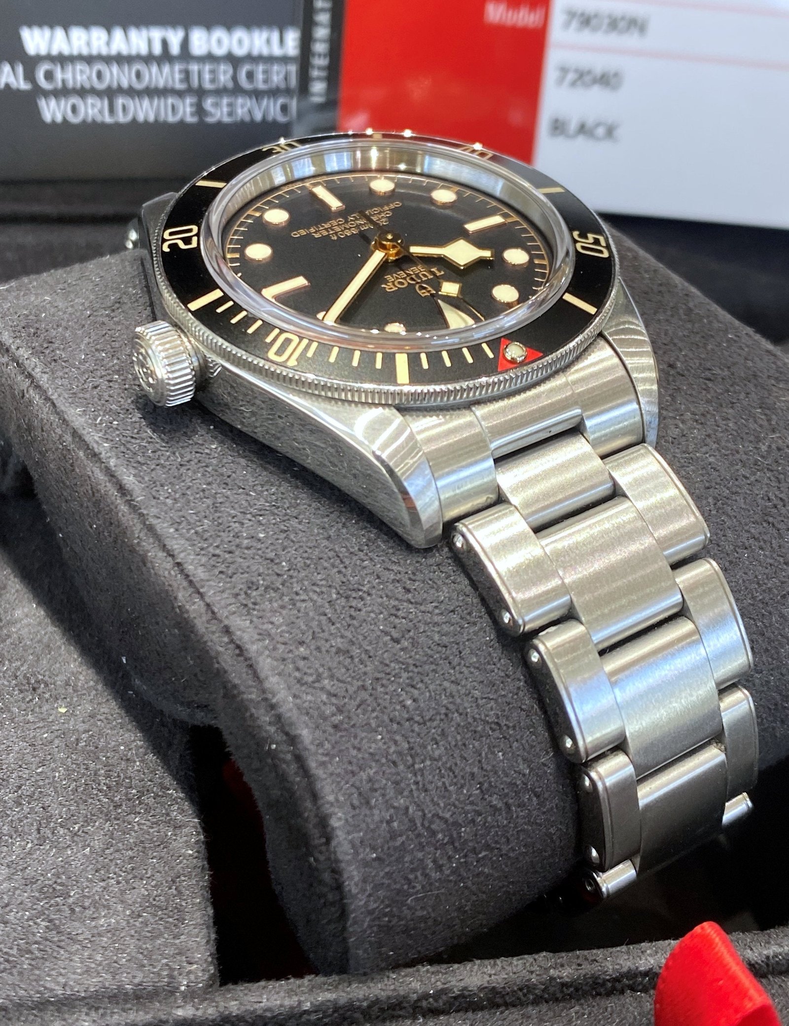 Dial: Domed black dial with date window at 3 o’clock aperture