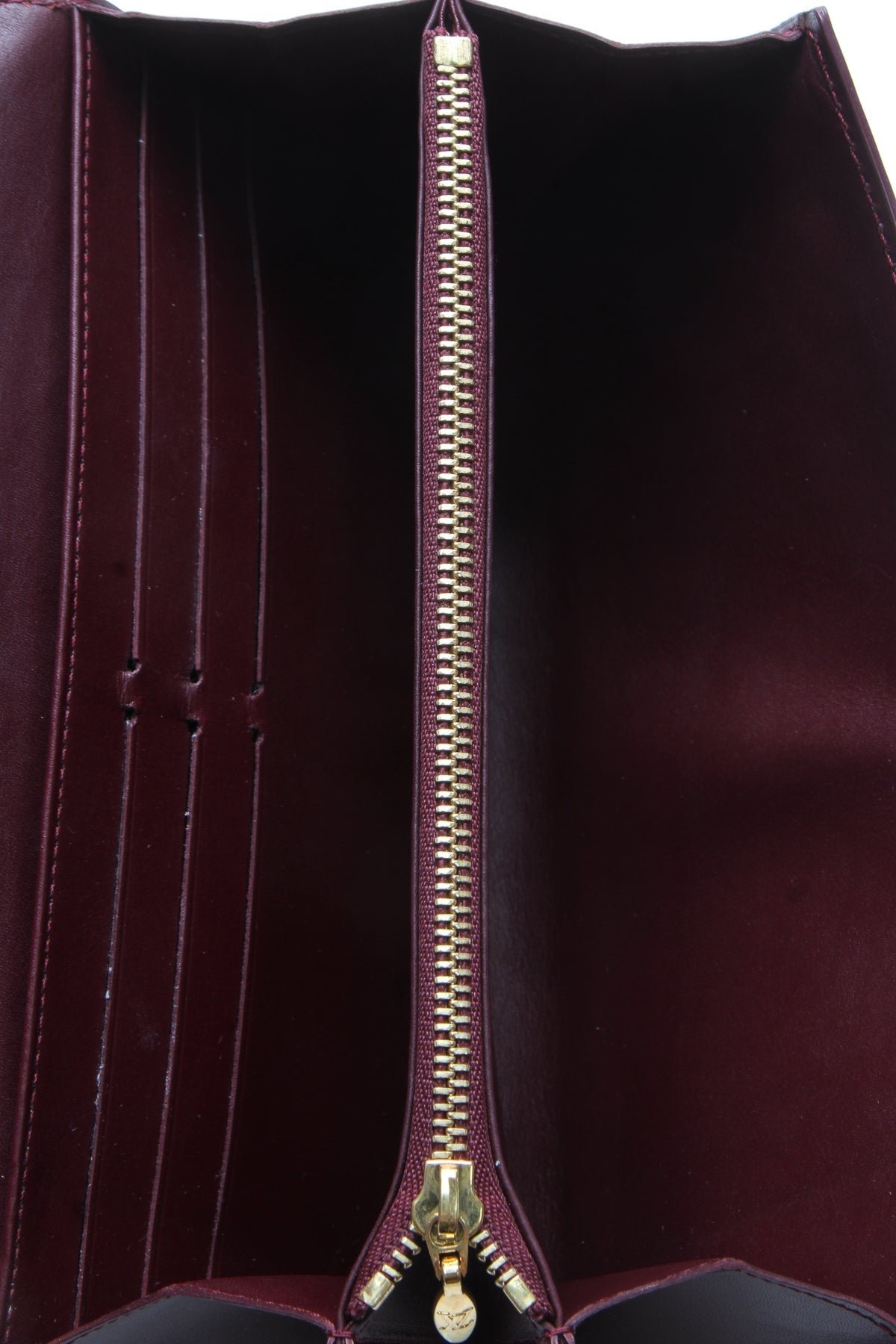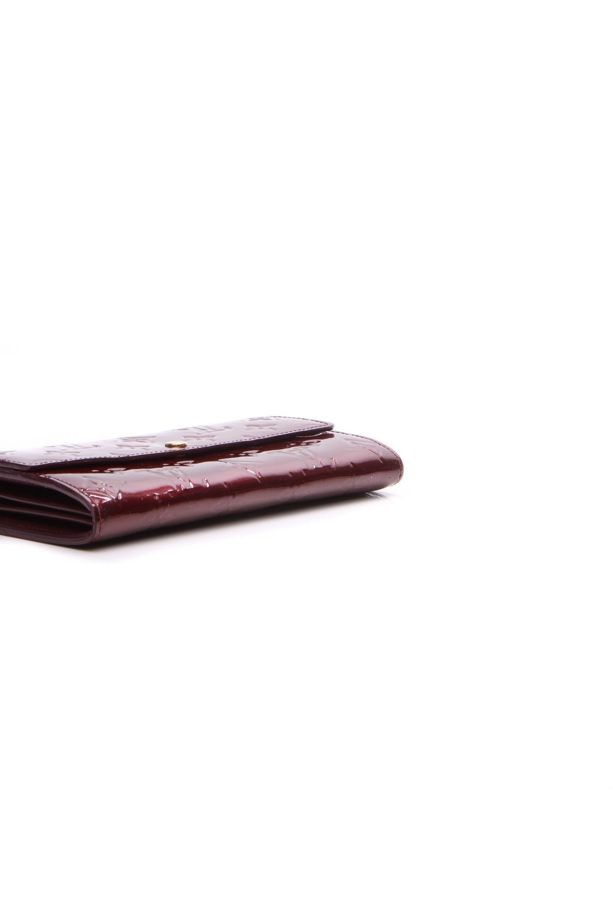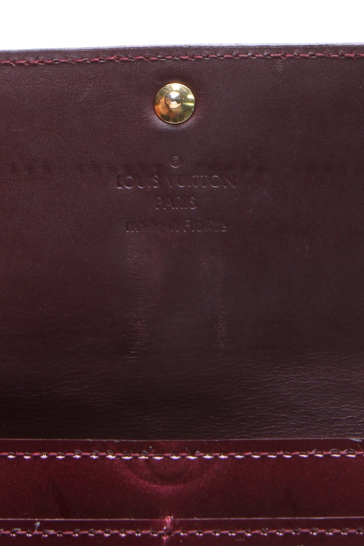 Fashion-forward meets functional in this authentic Louis Vuitton Sarah Wallet. In this piece, instantly-recognizable Monogram Vernis leather in a burgundy hue couples with classic gold-tone hardware to impart fun sophistication into any collection. Once unsnapped, a variety of zip and slip pockets ensure that this polished wallet is equally practical.