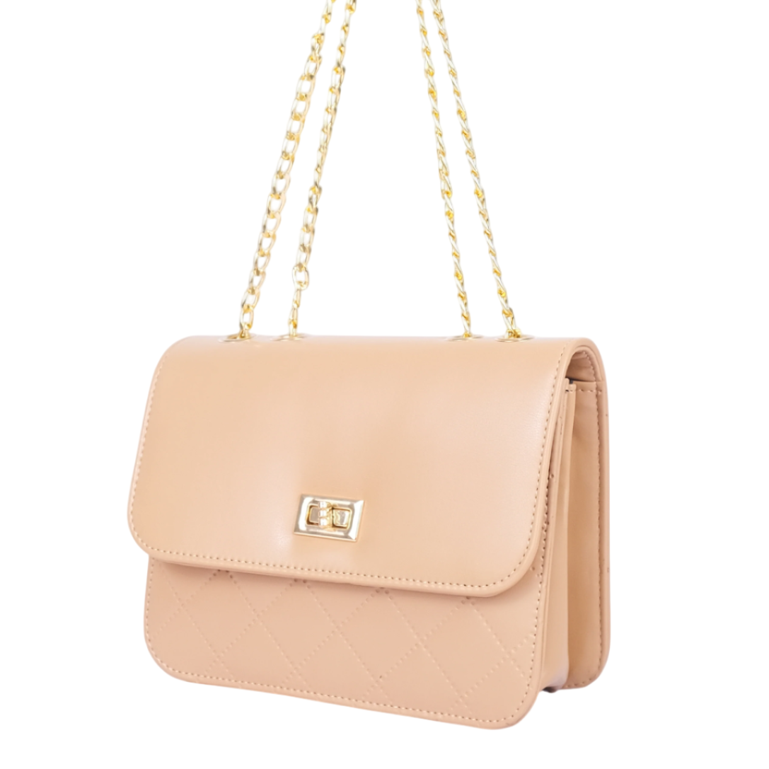 The women’s quilted shoulder bag with gold chain strap is crafted from premium beige faux leather, offering a sleek and versatile accessory for any occasion. Its structured rectangular shape with quilted stitching gives it a timeless appeal, while the gold-tone chain strap adds a sophisticated finish.